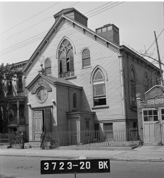 Greater St. John Community Church, former Anshei Krasnikof 471-473 Vermont Street are adjoining 3-story buildings. Congregation Anshei Krasnikof was formed by immigrants from the town of Krasnik in Poland. One source has the congregation dating to 1897, Ellen Levitt's book has it organizing in 1919. The 1940 tax photo on the right shows the ground floor of 471 Vermont still operating as a candy store while the building next to it was possibly acting as a storefront synagogue. Ownership transferred about 1968. |