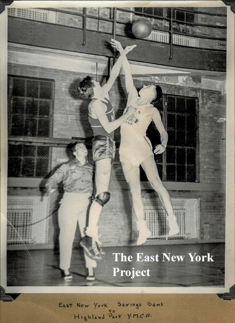 The Highland Park YMCA opened on July 1,1926. Peter Stango sent in this 1940s color slide shot, taken from Highland Park. Note the huge advertising sign on the roof and the pumping station chimney in the distance. Peter's Uncle Ray Stefano ws a referee in those days, and we see a tipoff at the Y featuring a game between the ENY Savings Bank and the YMCA team. | |