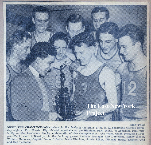 Championship team, 1941 Peter Stango also sent in this shot of his Uncle Ray DeStefano's championship plaque and a news clipping. His uncle recalls that the Prospect Park YMCA did not consider them a worthy enough opponent to face only to meet and get beaten by them in the finals. |