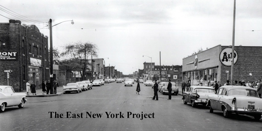 Pitkin Avenue, west across Vermont Avenue, 1959 On the left we can see Dan Luries's Vermont Moving and Storage warehouse; the architecture tips you off that it used be an old movie house. Constructed about 1916, the Vermont Theatre did not survive the talkie era and the property was in bankruptcy court by 1932. The entire block was cleared for the Grace Playground in the 1970s. The A&P on the right continues on today as a C Town supermarket. |